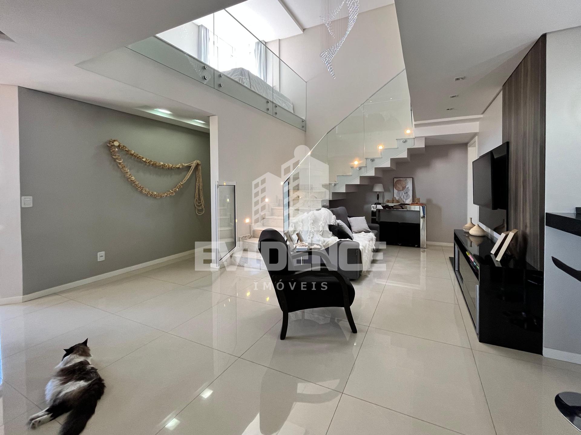 Contendo: 02 suítes, mezanino com escritório, sala de estar, sala de jantar, cozinha, lavanderia, varanda com churrasqueira, lavabo e duas vagas de garagem.